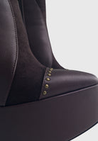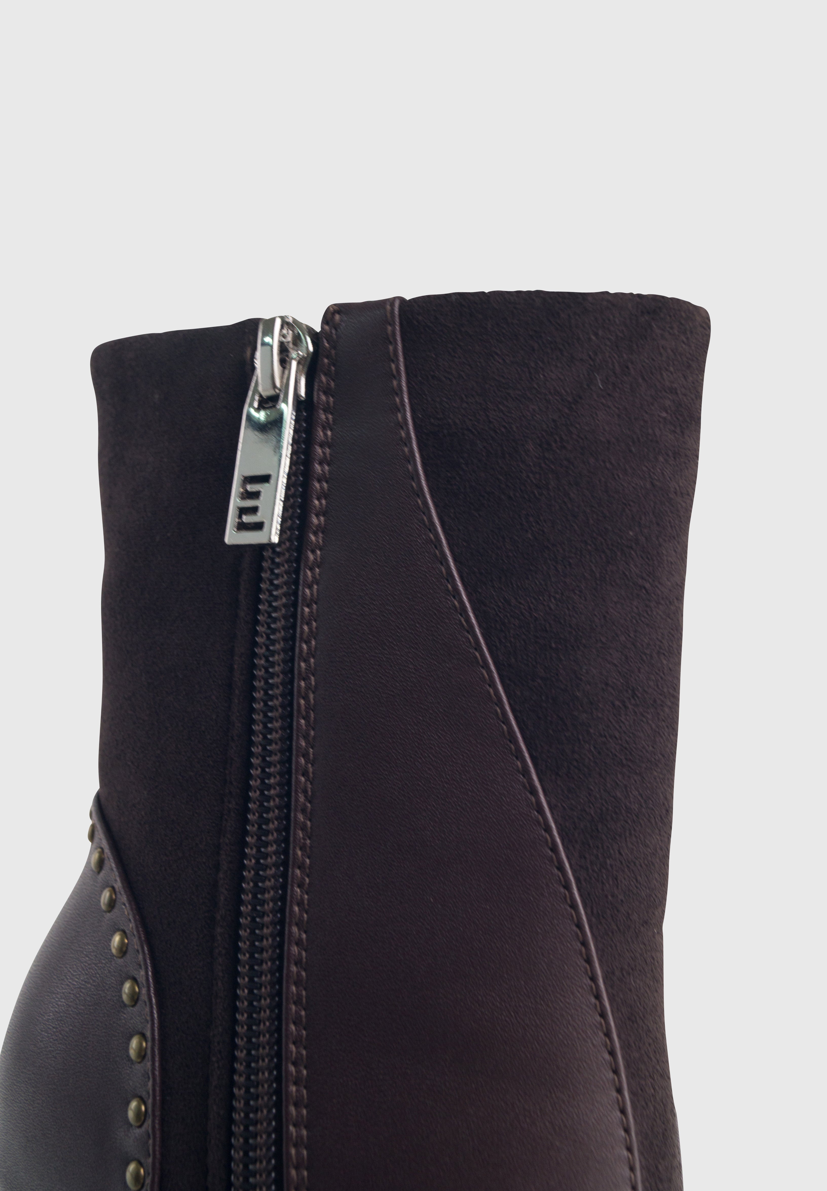 La tomaia in similpelle vegana premium è arricchita da inserti in camoscio e adornata con piccole borchiette che creano un look grintoso e sofisticato. Questi stivali sono perfetti per chi desidera un accessorio di tendenza che non passa inosservato.