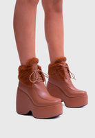 NOIRE Cammello Similpelle - Stivaletti zeppa lacci e collo in morbida eco-fur