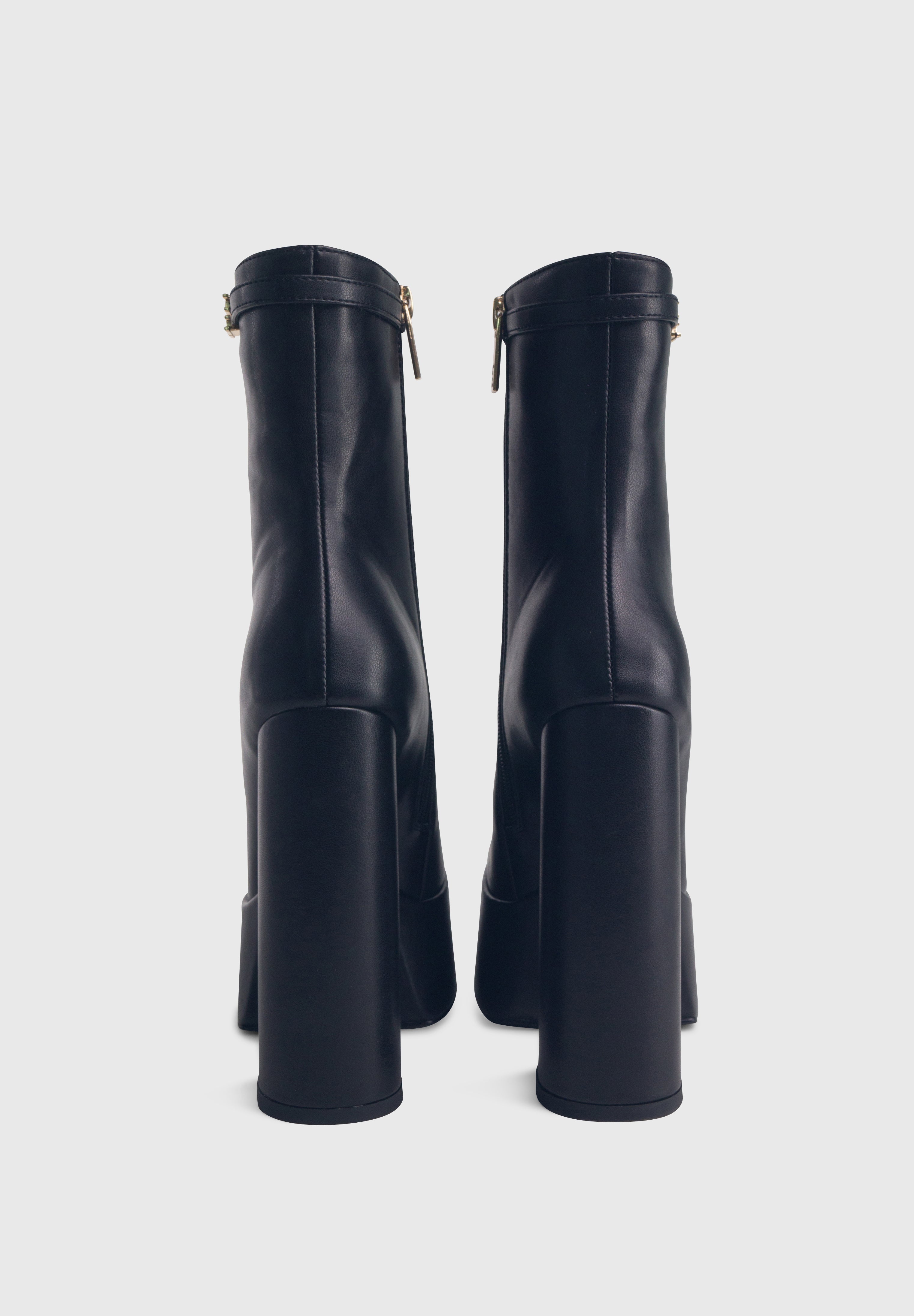 La punta e il plateau quadrati, insieme al tacco largo, creano un look strutturato e audace. Il gambale rigido, impreziosito da un bracciale logato sulla parte superiore, slancia e allunga visivamente la gamba. Il comfort è garantito dal perfetto equilibrio tra il plateau alto 5 cm e il tacco largo di 14,5 cm.