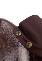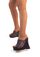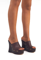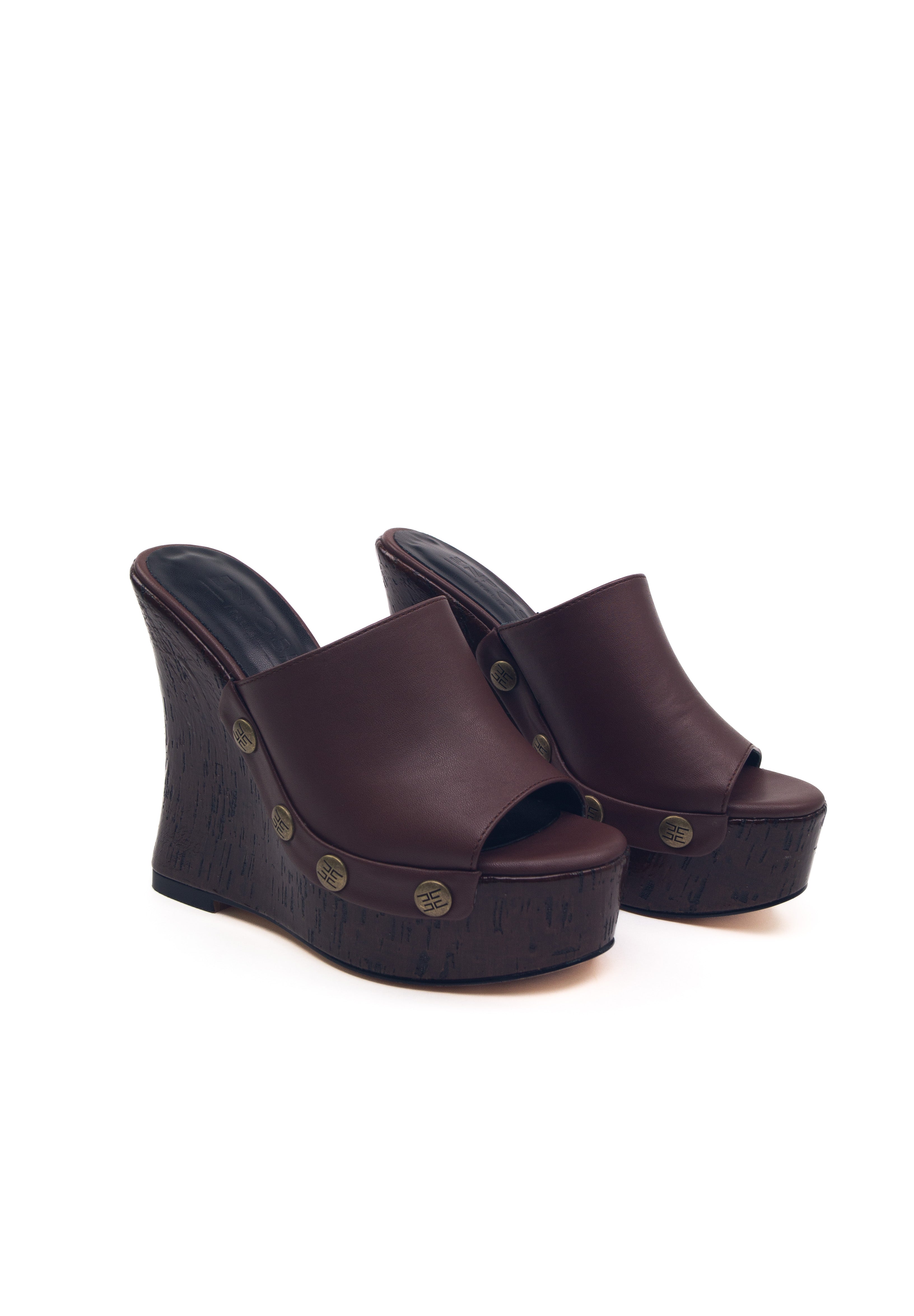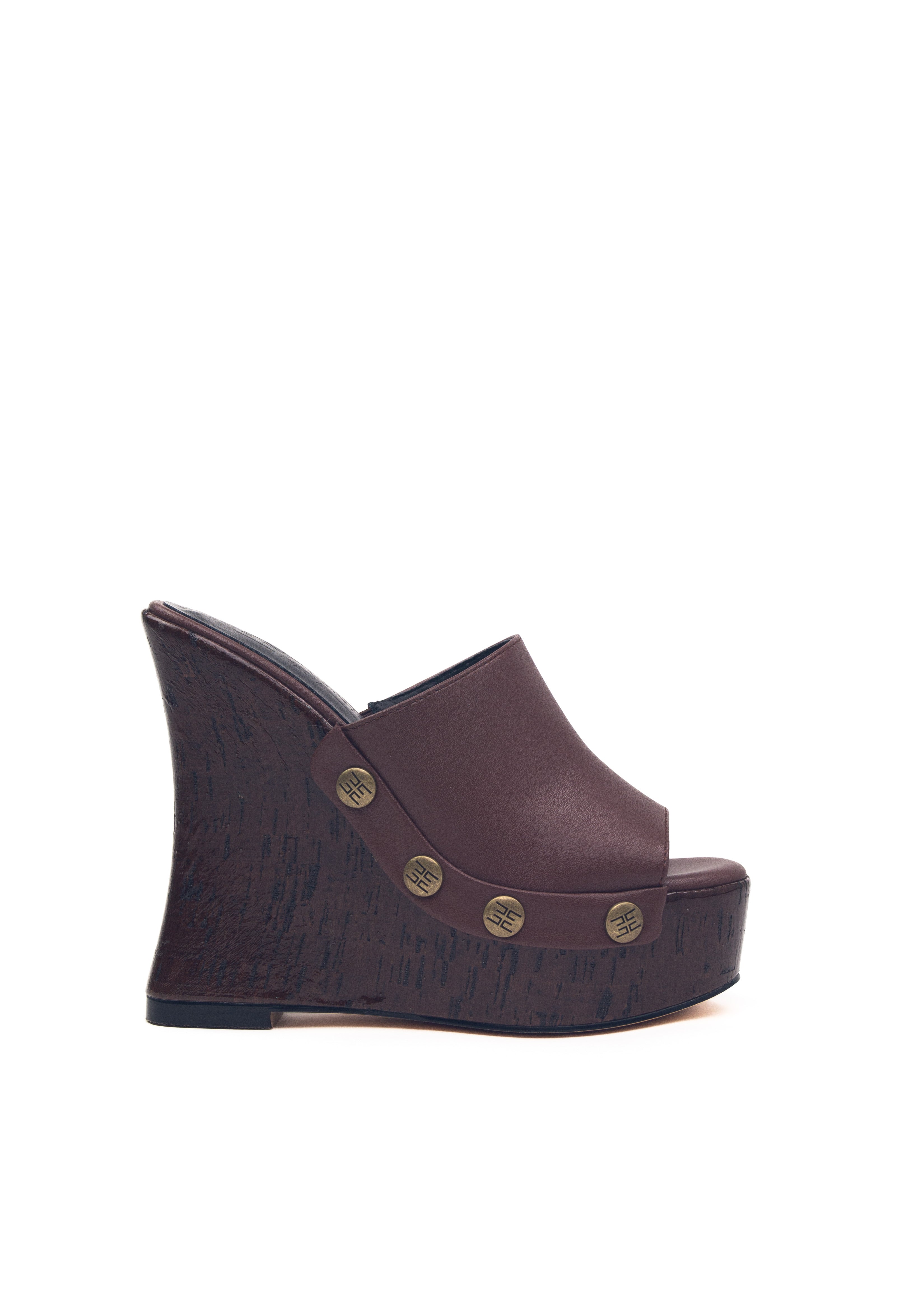 La sua zeppa scultura in legno effetto laccato non passa inosservata, con curve decise, slancia la figura con audacia. I rivetti dorati con logo inciso aggiungono un dettaglio grintoso e glamour.