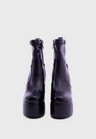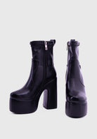 La tomaia in similpelle vegana premium fascia la caviglia con una linea pulita e sensuale; il bordo superiore con impuntura a zig‑zag e i tagli sagomati sul gambale valorizzano la silhouette. Il tacco largo scavato internamente e il maxi plateau creano un profilo scultoreo che slancia la figura mantenendo stabilità.