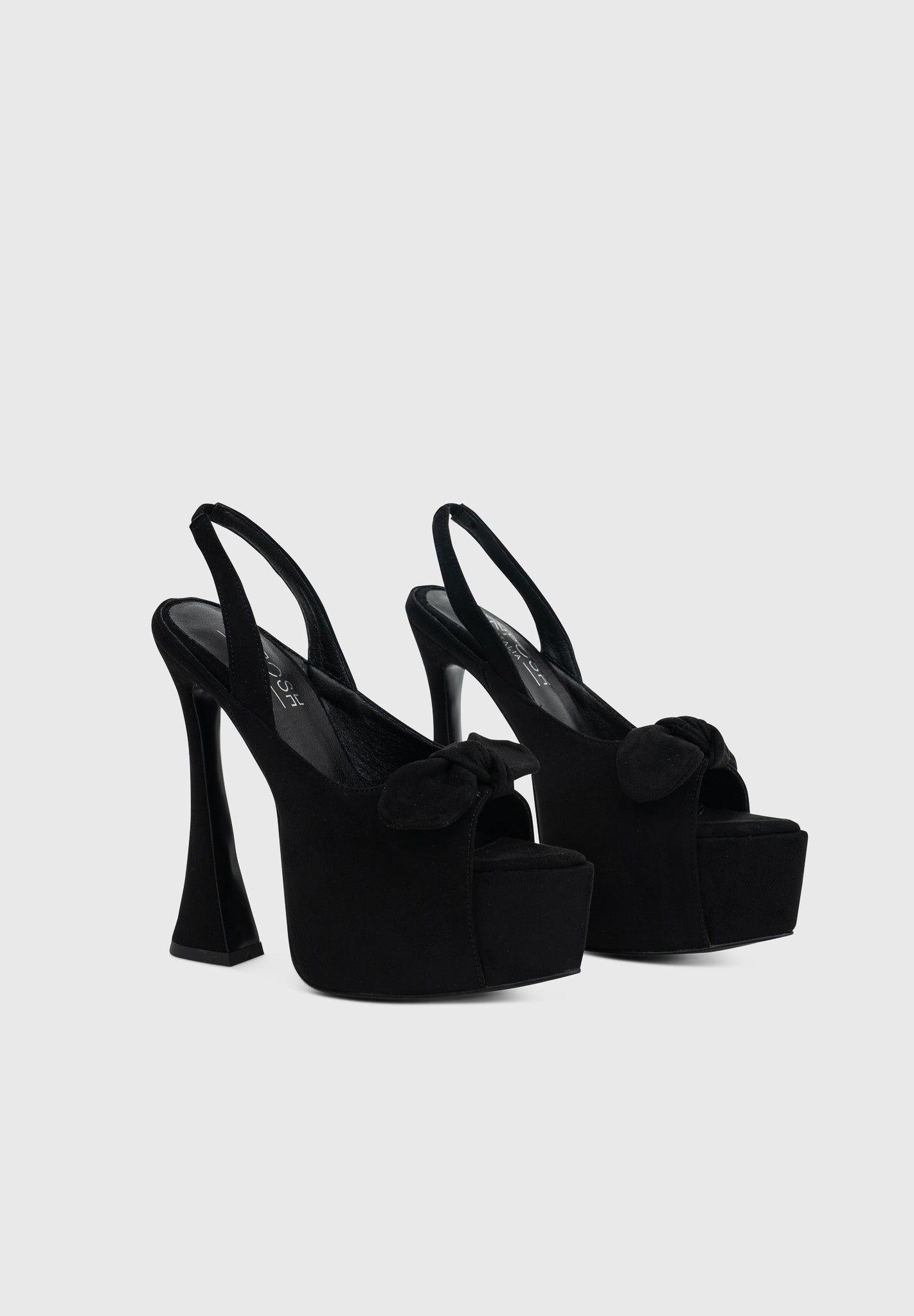 Crafted from premium vegan suede-effect material, these platform sandals feature a bold silhouette defined by the signature hourglass heel and elevated maxi platform.