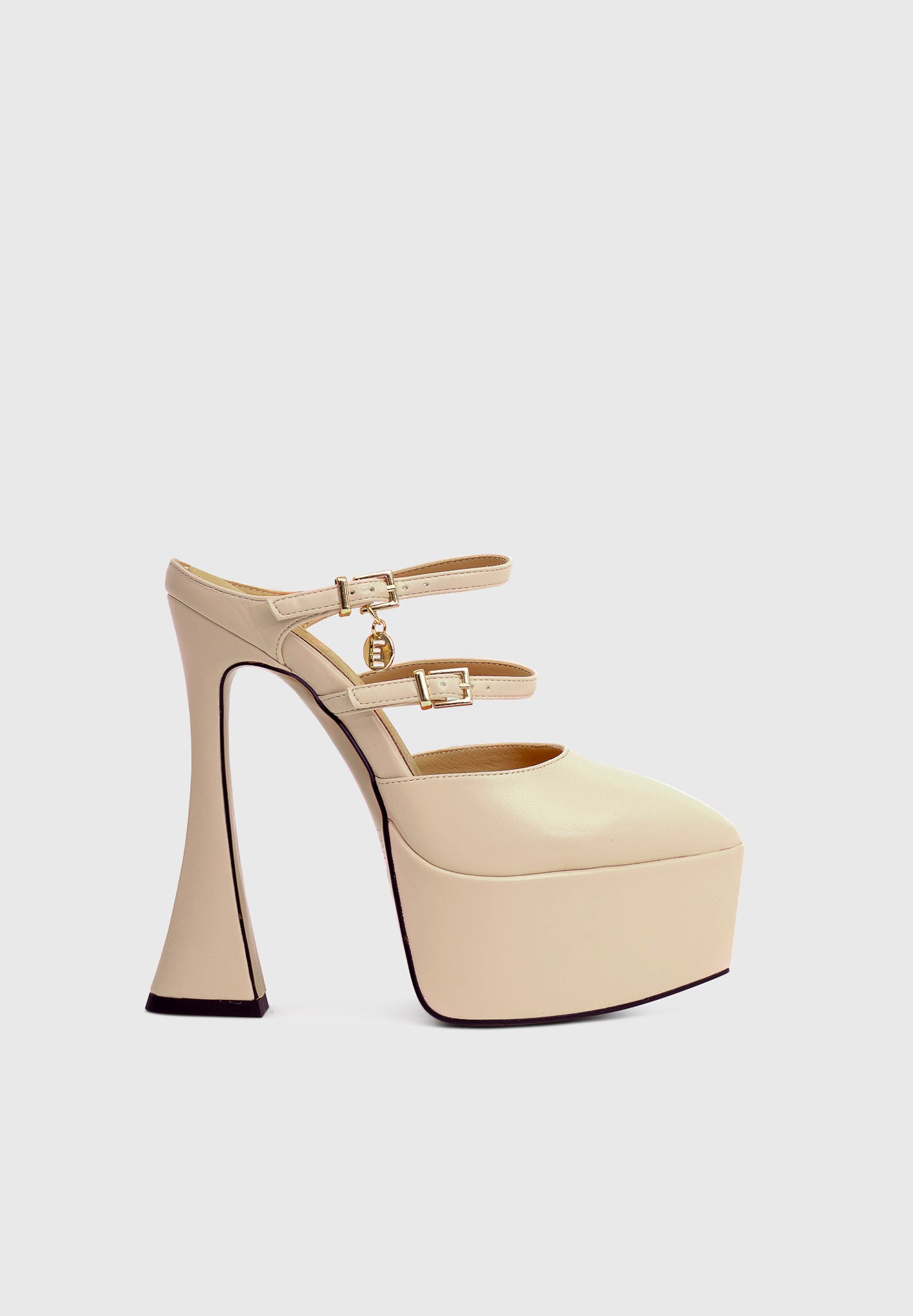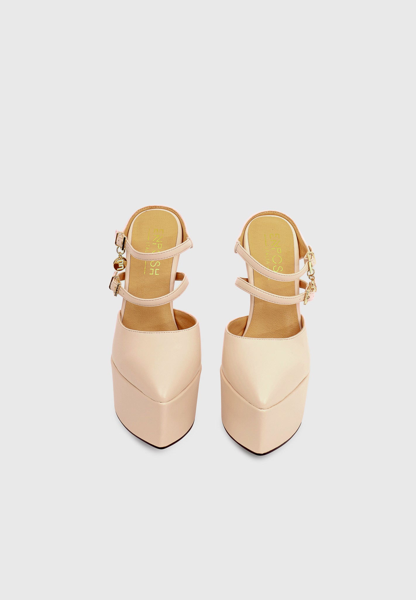 Estos zapatos plataforma combinan líneas limpias con el carácter del tacón en forma de reloj de arena, uno de los elementos distintivos de la colección. El doble cinturón ajustable con charm ENPOSH realza el empeine con un detalle refinado.