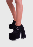 Réalisées en simili-daim végan haut de gamme, elles enveloppent le pied avec des lignes nettes et affirmées, soulignées par la bride à boucle métallique qui ajoute une touche distinctive et glamour. Le bout arrondi adoucit la silhouette, tandis que le talon large sculpté et la maxi plateforme offrent hauteur et élan sans compromettre la stabilité.