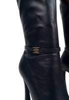 Un braccialetto circonda delicatamente la caviglia, impreziosito dal nostro nuovo charm logato in metallo oro, elegantemente posizionato sul lato laterale. Questo dettaglio unico unito alla particolarità del tacco alto a clessidra aggiunge personalità al design, rendendo questi stivali alti straordinari e inimitabili.